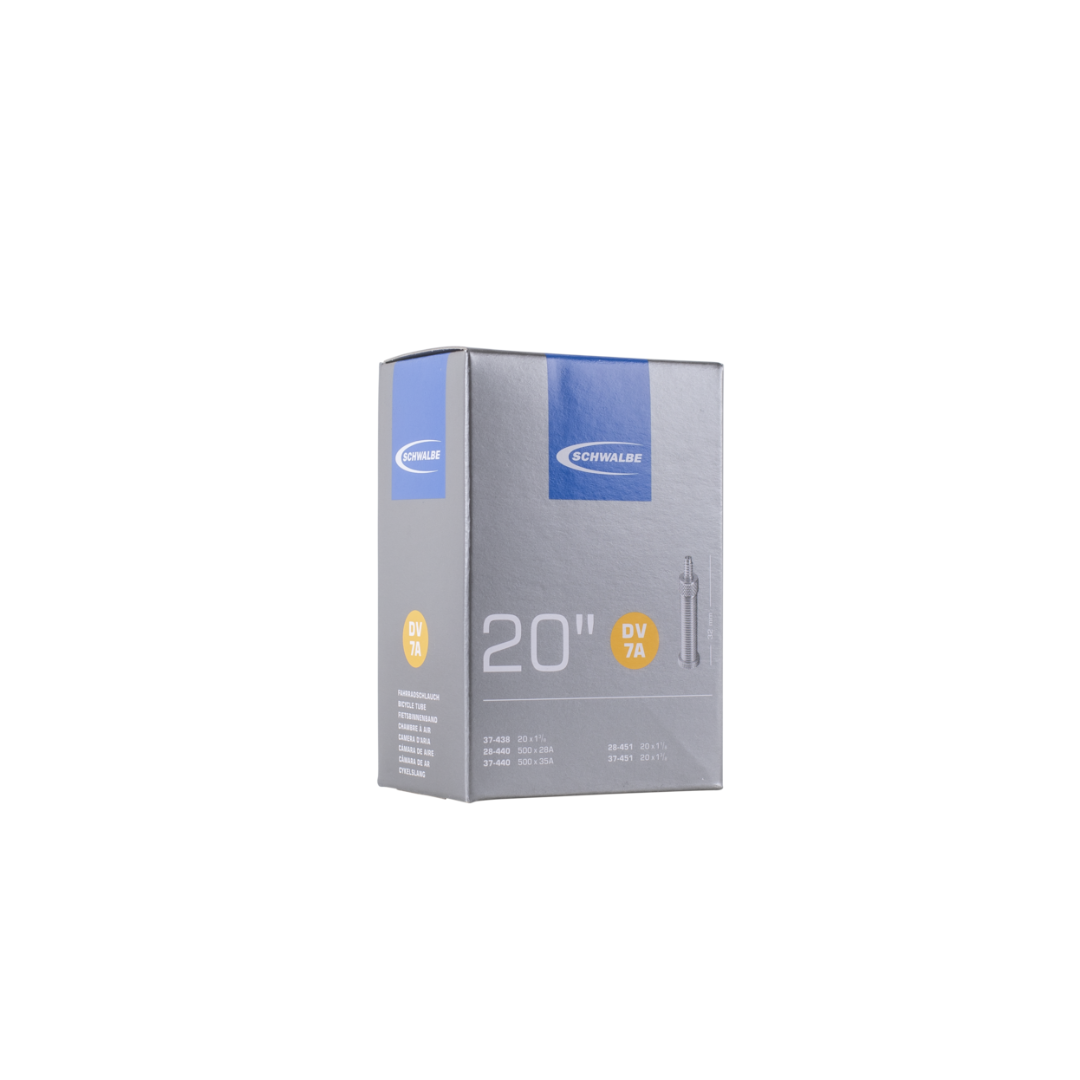 Schwalbe standard bicycle inner tube no. 7A. For bicycle tires in size 20" inch (ETRTO 28/37-438/451). Retains air for an above-average length of time. Thanks to the best material quality and uniform wall thickness. Maximum reliability that has proven itself millions of times over.