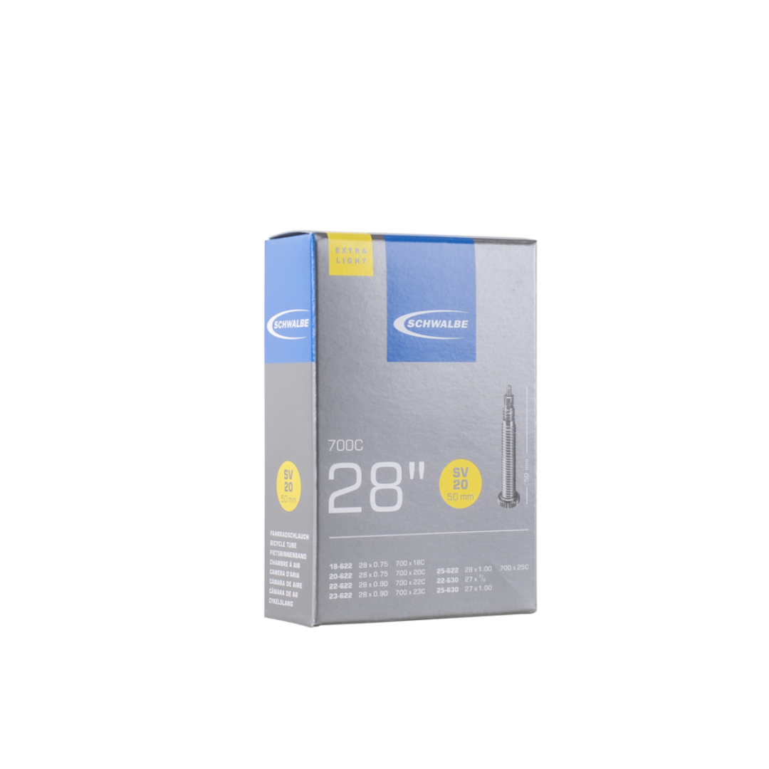 Schwalbe EXTRA LIGHT inner tube no. 20 for bicycle tires in size 28" inch/700C (ETRTO 18/25-622/630). Particularly suitable for road bikes. Lower weight, with the same reliability as a Schwalbe standard tube.